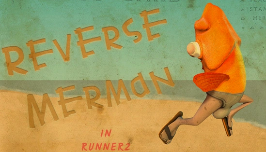Reverse Merman is a unlockable character in Runner 2: Future Legend of Rhythm Alien. He can be unlocked in The Emerald Brine. As his name would suggest, he possesses the upper body of a goldfish and the lower body of a human wearing underwear and sandals. Weirdly enough, he also has very prominent pair of balls that sway and jiggle as he moves about, in addition to visible pubic hair that shows through the leg holes of his underwear.